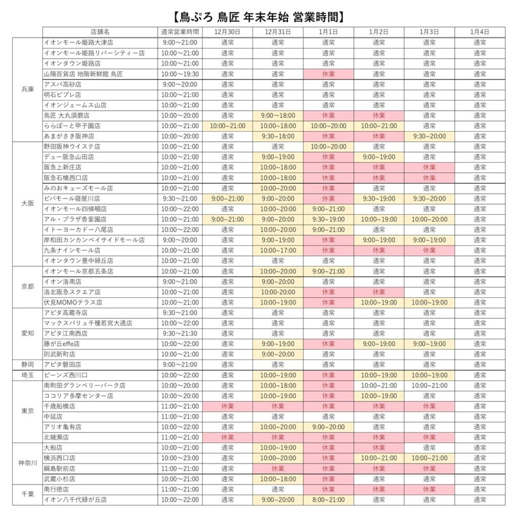 誠に勝手ながら年末年始の鳥ぷろ・鳥匠各店の営業は上記の通りとさせていただきます。